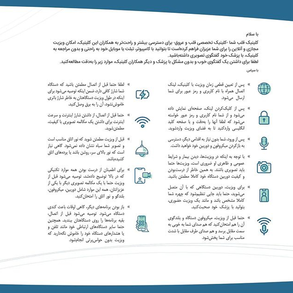 ویزیت آنلاین البته با یدککشیدن نام آنلاین و یک ارتباط تصویری ساده با پیامهای رسانهای معمول، همه مشکلش حل نمیشود. ویزیت آنلاین هم مانند ویزیت حضوری آدابی دارد و ضروی است که هم تیم درمان و هم بیمار، برای یک ویزیت مؤثر، اصول حرفهای آن را رعایتکنند و کاملا برای آن مهیا باشند. وگرنه آن هم مانند بساری از ویزیتهای حضوری با مشکلات بسیار روبرو خواهدشد و باعث میشود از وقت و انرژی و امکانات هر دو سمت، استفاده بهینه انجامنشود