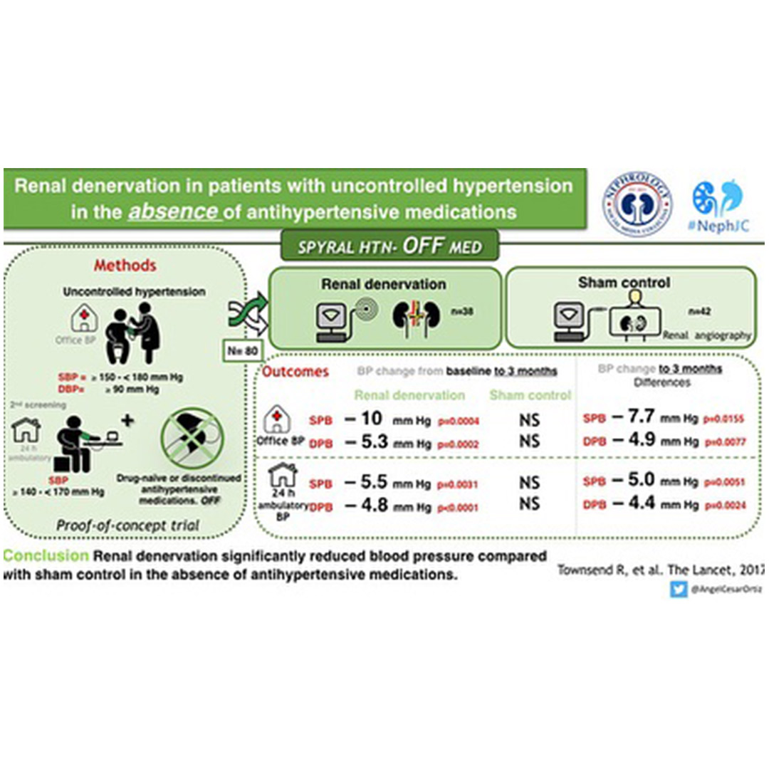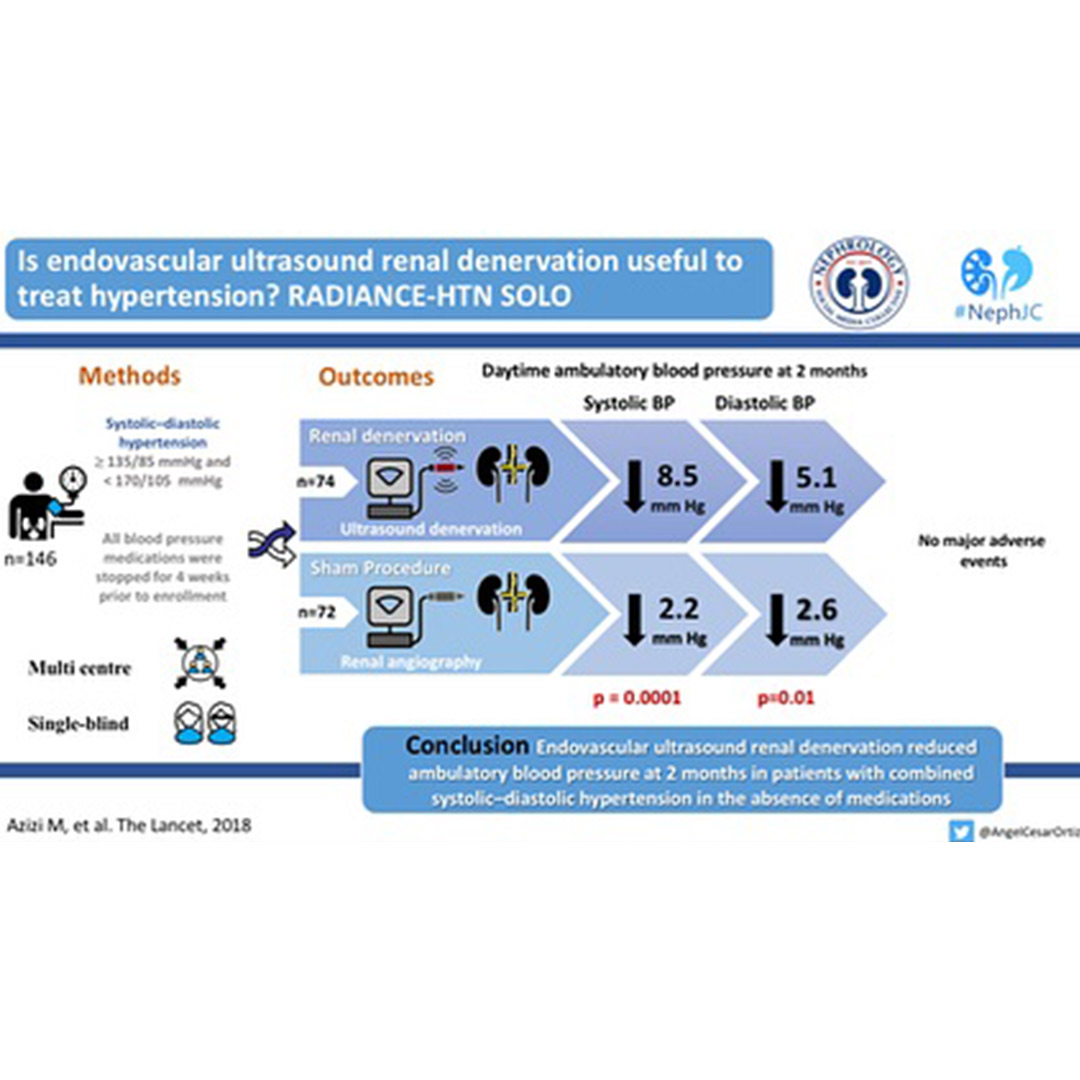 و در پایان هم مطالعهای که همزمان در یورو-پیسیآر اخیر ارائه شد و در لَنست هم به چاپ رسید RADIANCE-HTN SOLO البته مطالعههای قبلی همه ابلیشن اعصاب سمپاتیک در شریان کلیوی را با امواج رادیوفریکوئنسی انجام میدادند و این مطالعه آخر با اولتراسوند.